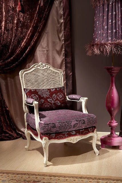 A chair from the Italian manufacturer Stella del Mobile. Curly legs and frame made of solid wood. Finish - white lacquer. Upholstery textile from the company portfolio. Seat supplemented with a removable pillow. The armrests are softened by pads. Elegant and comfortable model will be a highlight of your interior.