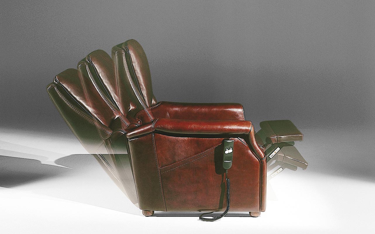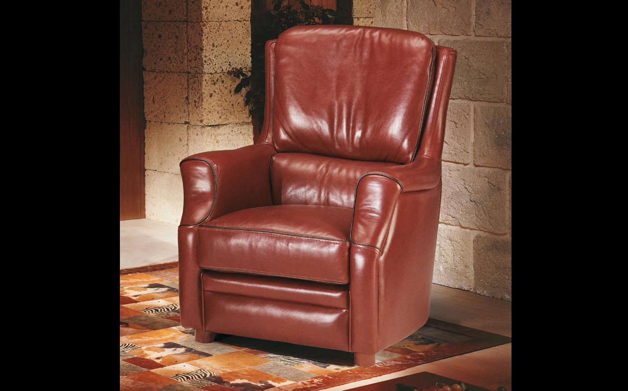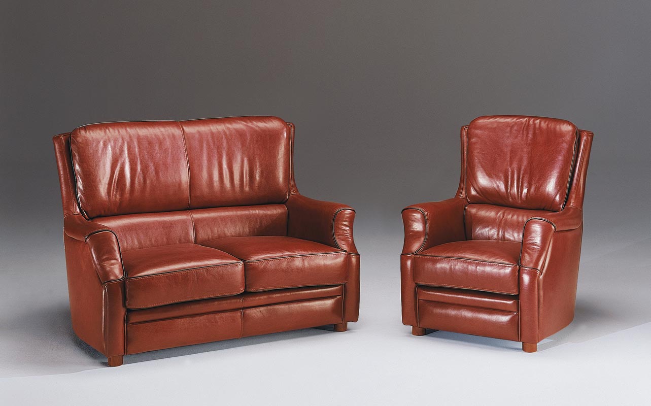 Norman sofa set from the Italian manufacturer Poles Salotti. Set consists of double sofa and leather recliner chairs. Comfortable furniture in classic style. Frame - wood,metal. Upholstery fabric - genuine leather from the collection company. Colours in stock.