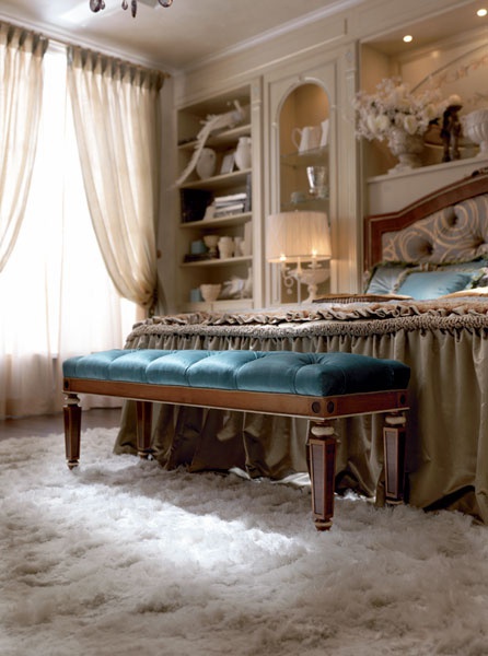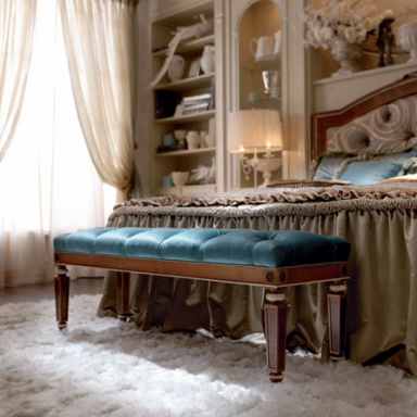 Bench upholstered fabric Italian producer of Martini Mobili. The bedside bench is upholstered with high quality textiles in green, wooden frame. The legs are tapered. A style classic.