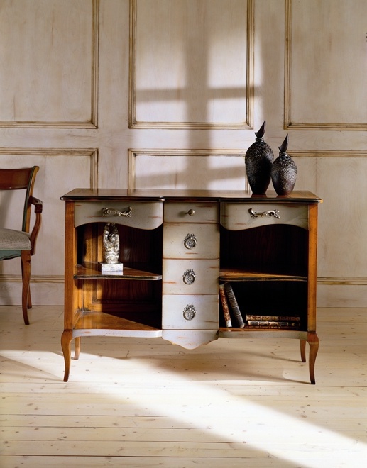 A chest of drawers from Italian manufacturer Stella Del Mobile. Includes open shelves and several drawers of different sizes. Legs and a body made of solid wood. The finishing - varnish. Handles of metal. The model is made in classic style.
