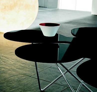 Coffee table Tonin Casa is shaped like a flower. The table base is made of chrome plated steel with top in tempered glass black, white or color aquamarine
