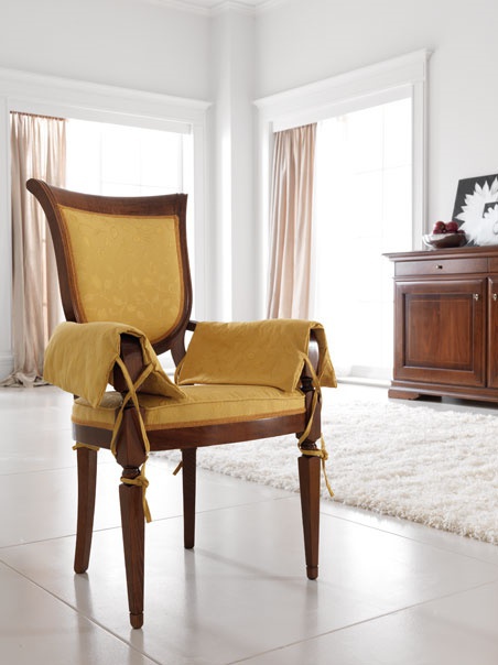 A chair from the Italian manufacturer at the stilema stand. The frame and legs made from solid wood. The surface is covered with a glossy varnish. Seat and back covered with textiles. Color option to choose from a collection factory. The armrests are complemented with soft pads. The model is made in classic style.
