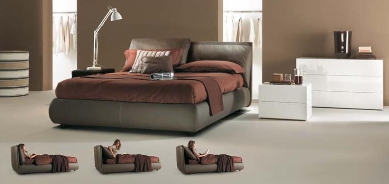 The Malou bed from Italian manufacturer Bontempi Casa. The frame is made from solid wood, upholstered in leather or fabric from the range campaign. Model with double cushioned headboard. A chic choice for the bedroom in modern style. Colors: brown, gray.
