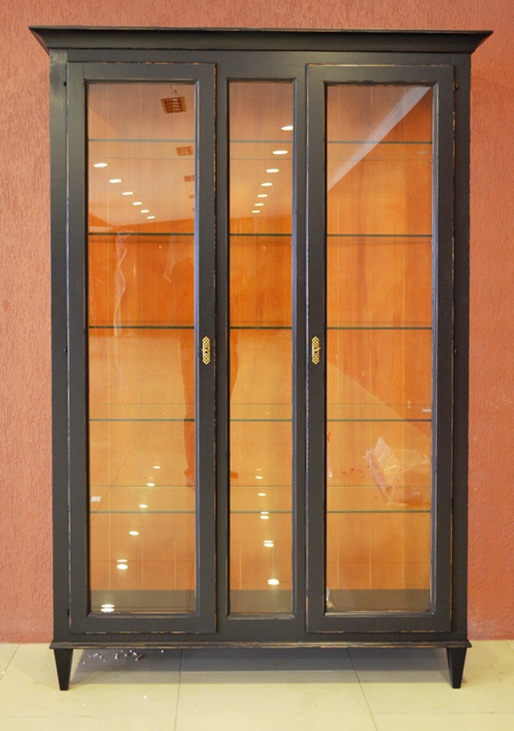 Showcase from the Italian manufacturer Tonin casa. The sash and the sides glazed. The frame and legs of solid wood. The surface of artificially aged and painted black. Internal padding - the shelves are made of transparent glass. The model is made in classic style.