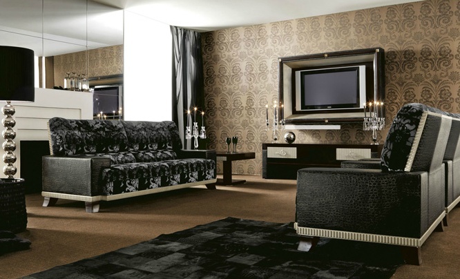 Sofa set Italian producer from Florence Collections. Consists of sofa, coffee table, furniture for TV and armchairs. Material - solid wood, glass and textiles. The frame and legs lacquered. Upholstered in leather from the company portfolio. The model is decorated with carved decoration. Colors - brown. Set is made in art Deco style.