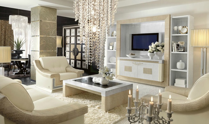 Sofa set Italian producer from Florence Collections. Consists of sofa, coffee table, furniture for TV and armchairs. Material - solid wood, glass and leather. The frame and legs lacquered. Upholstered in leather from the company portfolio. The armrests are upholstered in leather with contractnum print. The model is decorated with carved decoration. Colors - white with beige trim.