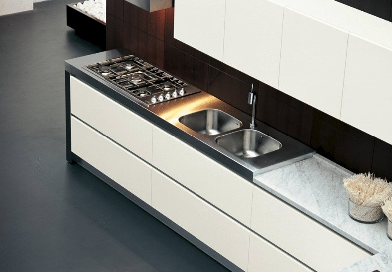 Kitchen Area from the Italian manufacturer Bontempi Casa. Set is trimmed with stainless steel. Kitchen in a modern style. Colors: white, steel, gray.