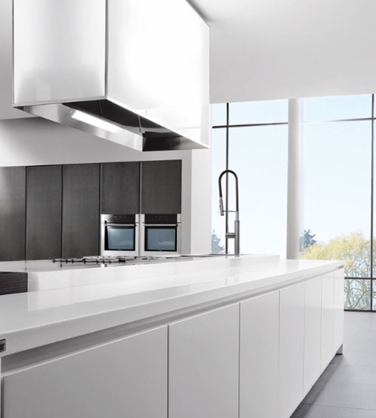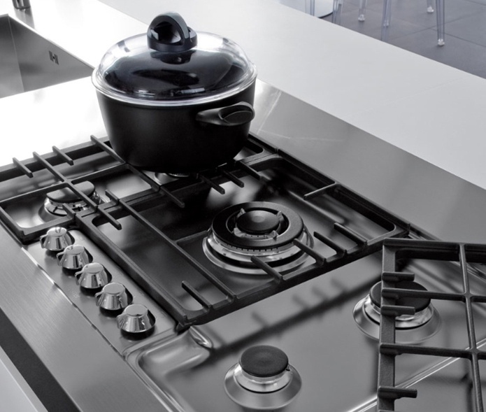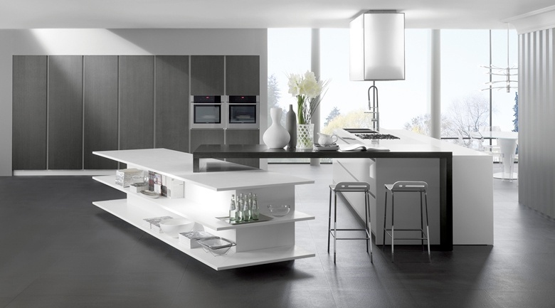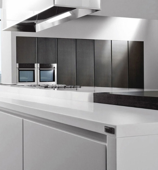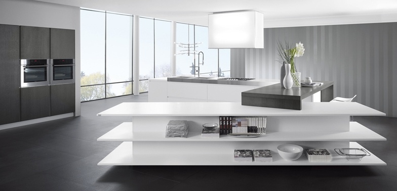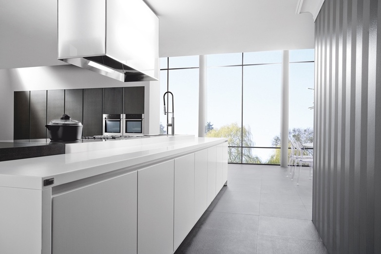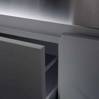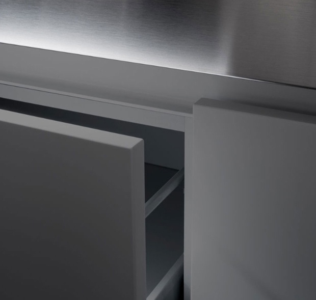 Kitchen Area from the Italian manufacturer Bontempi Casa. Furniture with doors made of MDF finished with veneer and steel. Kitchen in a modern style. Colors: white, steel, gray.