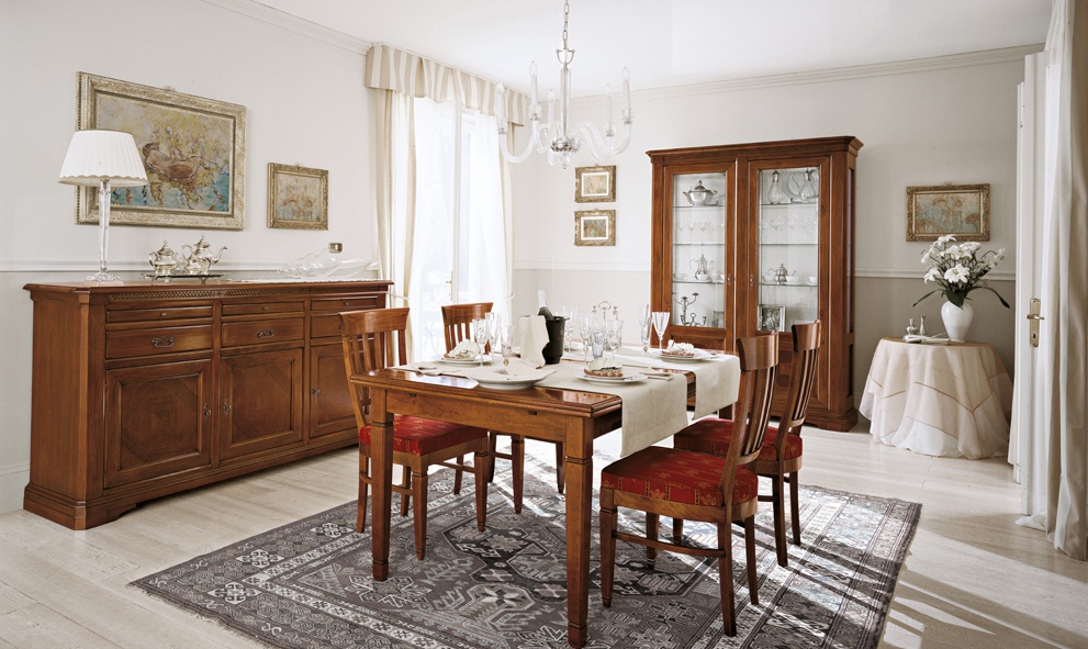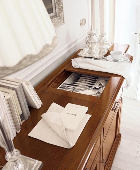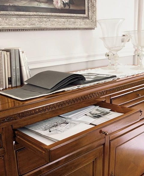 The buffet from the Italian manufacturer Bruno Piombini. The frame is made from solid poplar. Model with space for storage of utensils. A lovely choice for a dining room in classical style. Colors: natural wood color, brown.