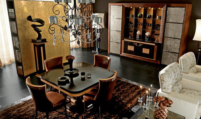 Consists of dining table, showcase, cupboard and chairs. Material - solid wood. The frame is covered with varnish. The chairs are made of wood. The model is decorated with carving. The facade Windows are made of glass. Upholstered in textile or leather from the company portfolio. The back is slightly rounded. The table is made in square shape. Colors - brown, silver.