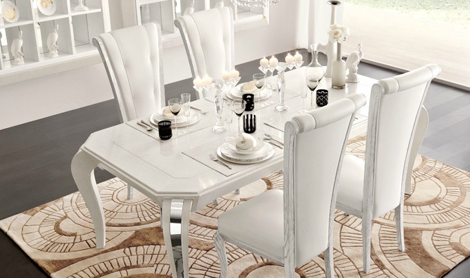 Italian dining room set for the production of Florence Collections solid wood. Consists of dining table and chairs. Material - solid wood. The frame is covered with varnish. The chairs are made of wood. Upholstered in leather from the company portfolio. The legs are made in the form of Cabriole, with metal decoration. Colours - white, silver. Set is made in modern style.