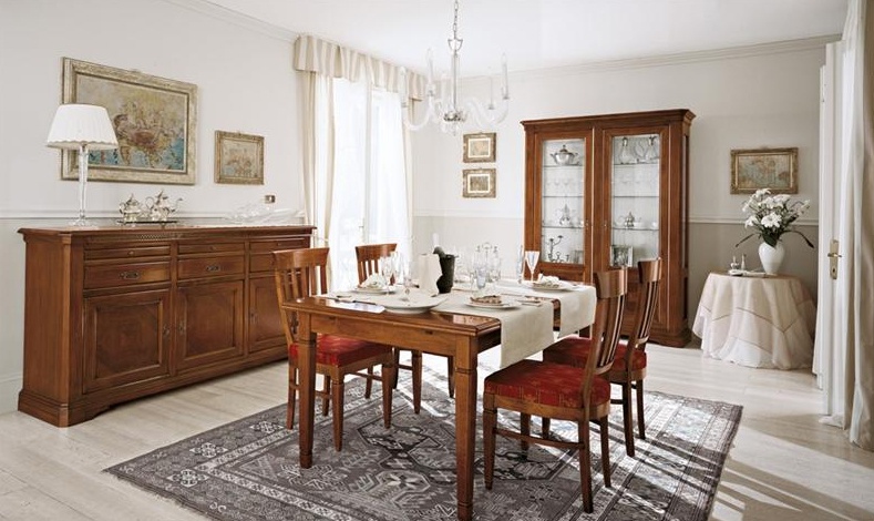 The sliding 4438 dining table from Italian manufacturer Bruno Piombini. The frame is made of solid beech. The model is rectangular. A wonderful choice for the dining room in a classic style. Colors: natural wood color, brown.