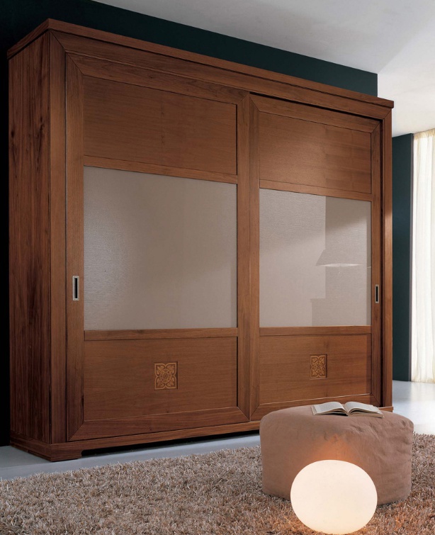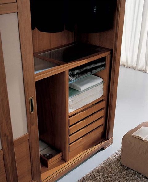Wardrobe 8092W from the Italian manufacturer Bruno Piombini. The frame is made from solid beech, doors glass. Model with drawers and sliding doors. The product is decorated with inlay. A perfect choice for bedrooms in classic style. Colors: natural wood color, brown.