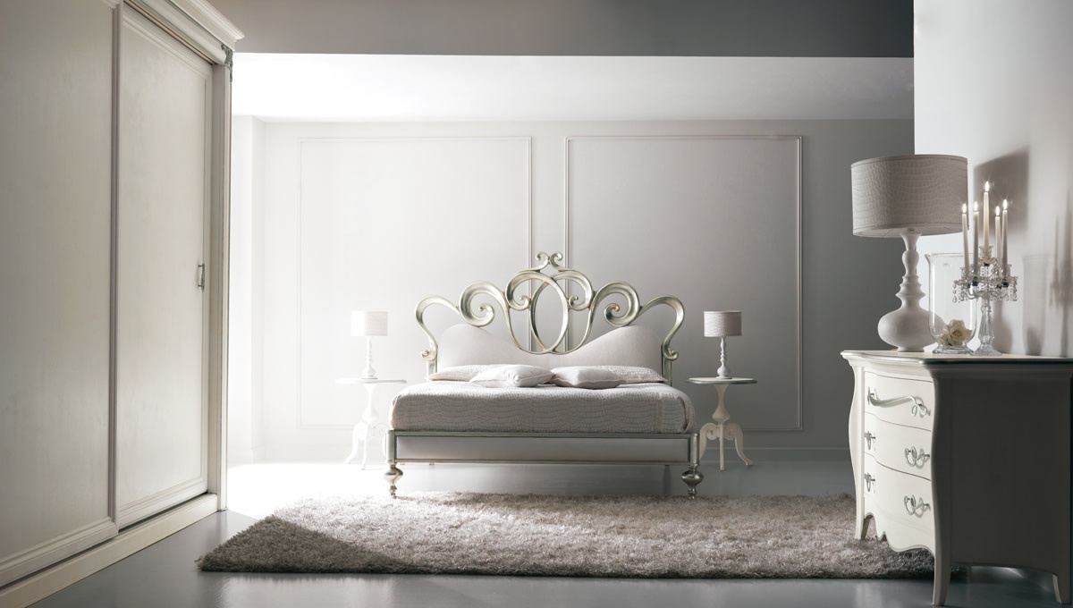 Bed with high headboard Letto Sofia from the Italian manufacturer Corte Zari. The legs are made of solid wood, upholstery - leather or textiles from a range of campaigns. A model with a headboard in the shape of a crown. A chic choice for the bedroom in classic style. Colors: white, Golden, black.