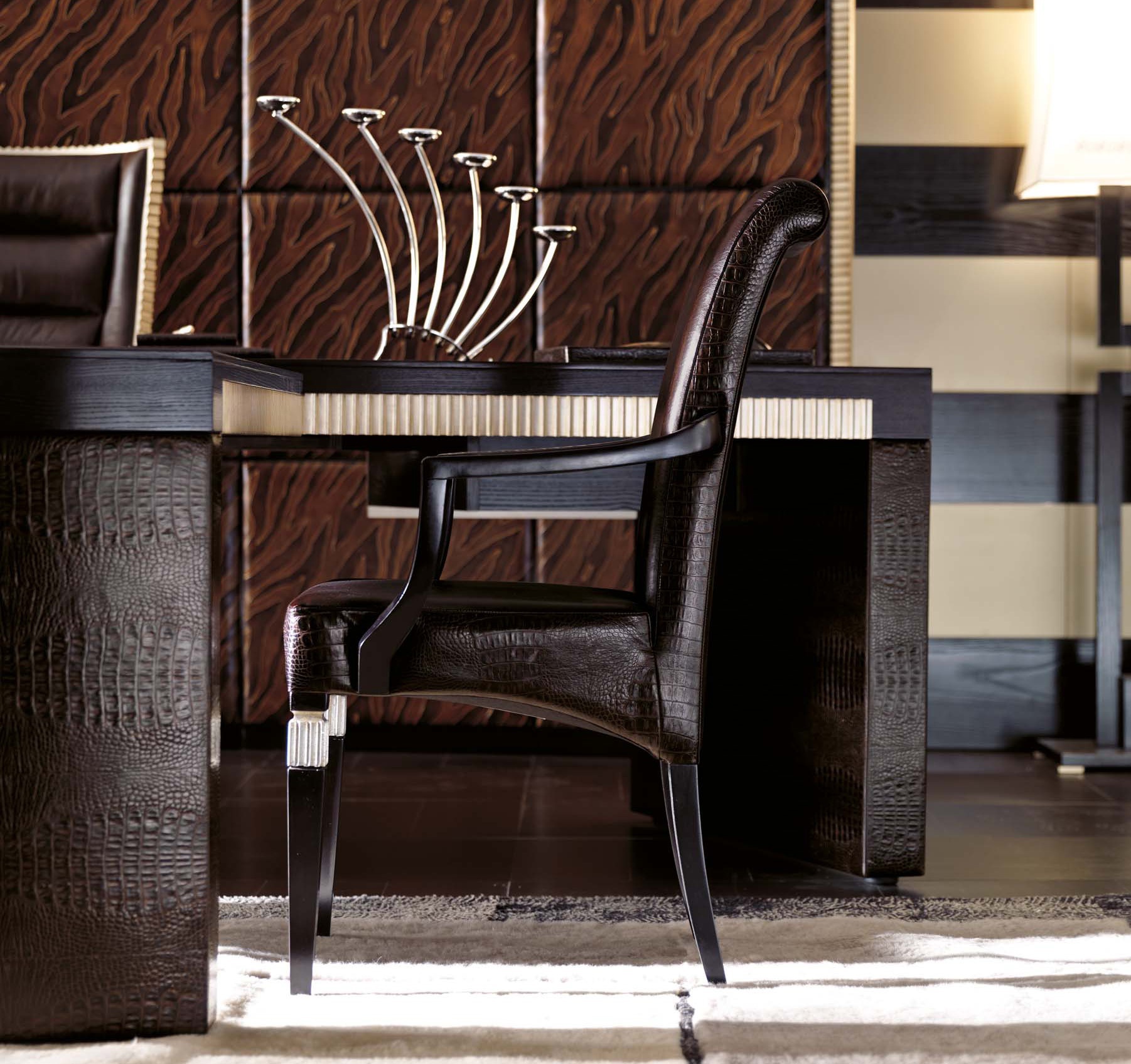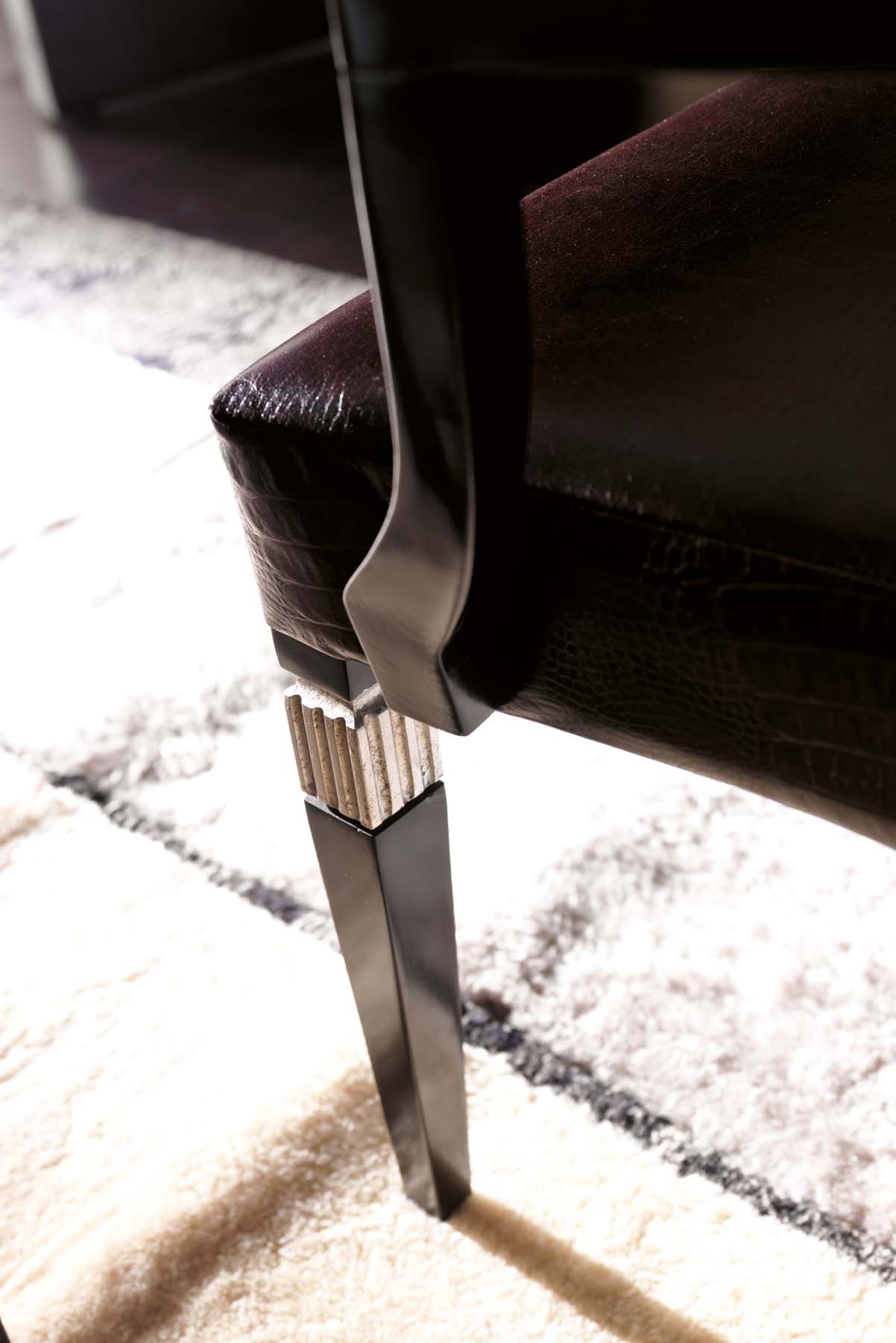 | Description: | A chair from the Italian manufacturer Florence Collections. The model with armrests and high back. The frame is made from wood. Finish - Atlantique 6/1 cat.A. Leather upholstery Spaniel 10/3 Testa di Moro cat.A + 8/2 Royal leather Cocco Chocolate cat.B. Elements of design silver foil. |