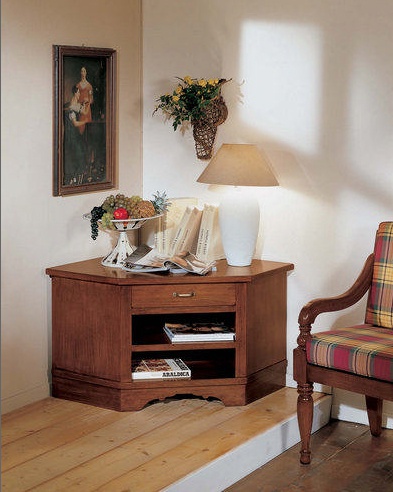 Bedside table for TV 1010 from the Italian manufacturer BTC. The frame is made from solid wood. Model a corner with a drawer. A pretty choice for interiors in classical style. Colors: natural wood color, brown.