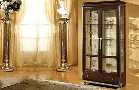 Showcase Miro from the Italian manufacturer Lanpas. The model is made in classic style. The frame and legs are made of solid wood. The sash and the sides glazed. Inside there are shelves for storage. The doors are locked.
