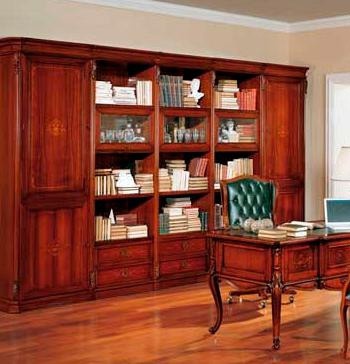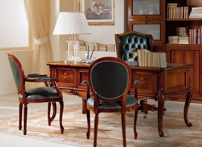 Headsets for office 02 Isabella from the Italian manufacturer Antonelli Moravio. Set includes Desk, chairs with armrests, rotating seat with a high back and a module for books. The furniture is made of solid poplar or Tulip, the surface is treated with varnish from the range of the campaign. Upholstery - leather. Set is decorated with inlay. Office in classical style. Colours in stock.