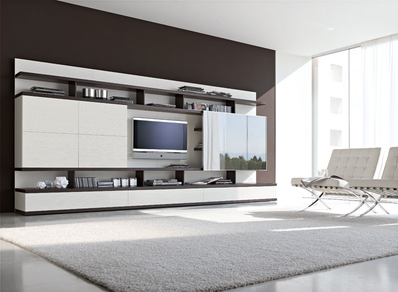 Modular system made of solid wood, from the Italian manufacturer Santarossa. The frame is made from solid wood. Finishing varnish from the company portfolio. The model assumes that the section for books and a section for TV. TV hidden behind mirror dirceu. Colors - white and brown. The system will perfectly complement the modern interior living room.