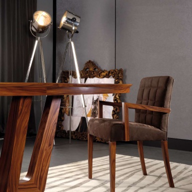 Chair chair with armrests SPIGA from the Italian manufacturer MOBILIDEA. The chair is made in the style of 70-ies, with a low backrest and wooden armrests. The company offers two types of upholstery and fine fabrics or leather. The frame of this chair is made of solid wood of dark color. Create a unique interior in the living room or the library. This model has a strong but convenient form of the armrests.