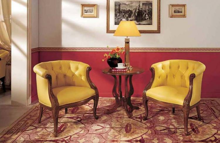 Sofa set from the Italian manufacturer Mirandola Export. Presents models of chairs with armrests and a coffee table. The upholstery leather. A style classic. Headset color of natural wood and yellow upholstery.