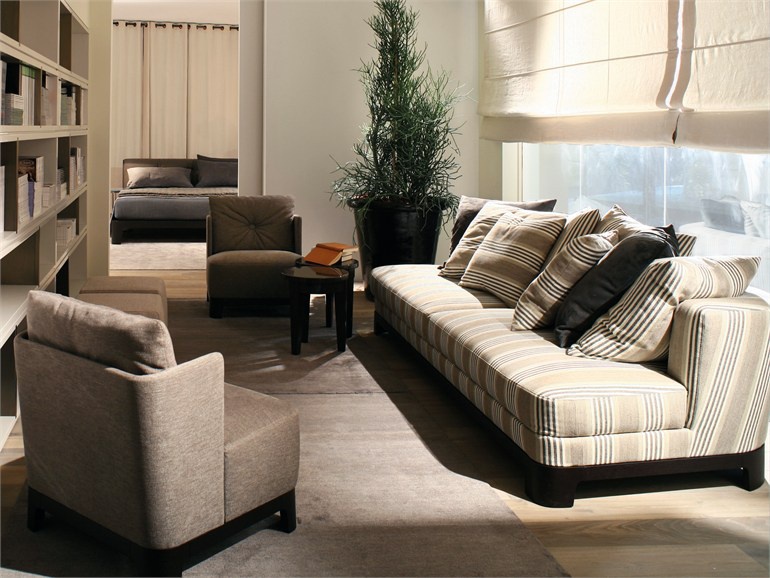 The Keaton sofa Sofa from Italian manufacturer Meridian. The base and legs are wood. The housing can be completely covered with genuine leather or textiles. A wide range of color options. Filler - polyurethane foam of different firmness. Low the back is supplemented with decorative pillows.