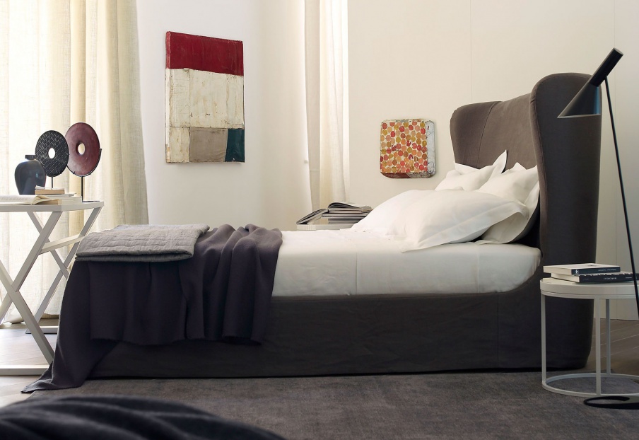 Double bed Loren ghost from the Italian manufacturer Meridiani. Model with high headboard. The frame and legs are made of wood. Removable textile or leather upholstery. Elegant and modern bed will adorn any interior.