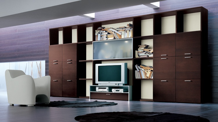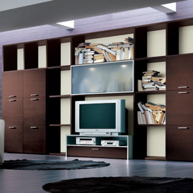 Modular system for TV from the Italian manufacturer Mobiltrevi. Consists of shelves and cabinets to store books. Material - solid wood. The surface may be treated with varnish or Sonam. The model is made in modern style.