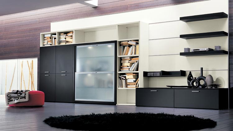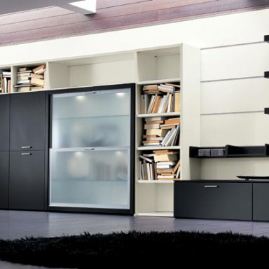 Modular storage system from Italian manufacturer Mobiltrevi. Consists of shelves and cabinets to store books. The material is solid wood. The surface may be treated with varnish or Sonam. Shutters and shelves made of frosted glass. The model is made in modern style.
