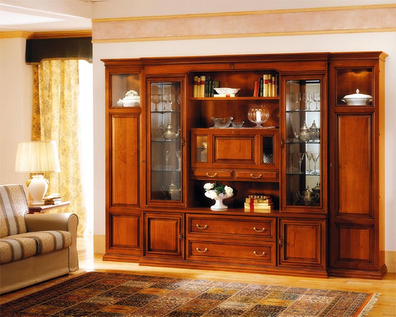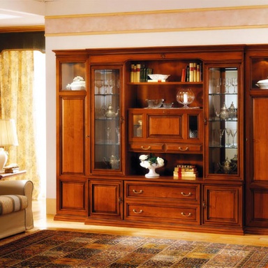 Wall from the Italian manufacturer Mobiltrevi. Consists of shelves of cabinets for storing books. Material - solid wood. The surface may be treated with a varnish or veneer. Shutters and shelves made of transparent glass. Fittings made of metal. The model is made in classic style.
