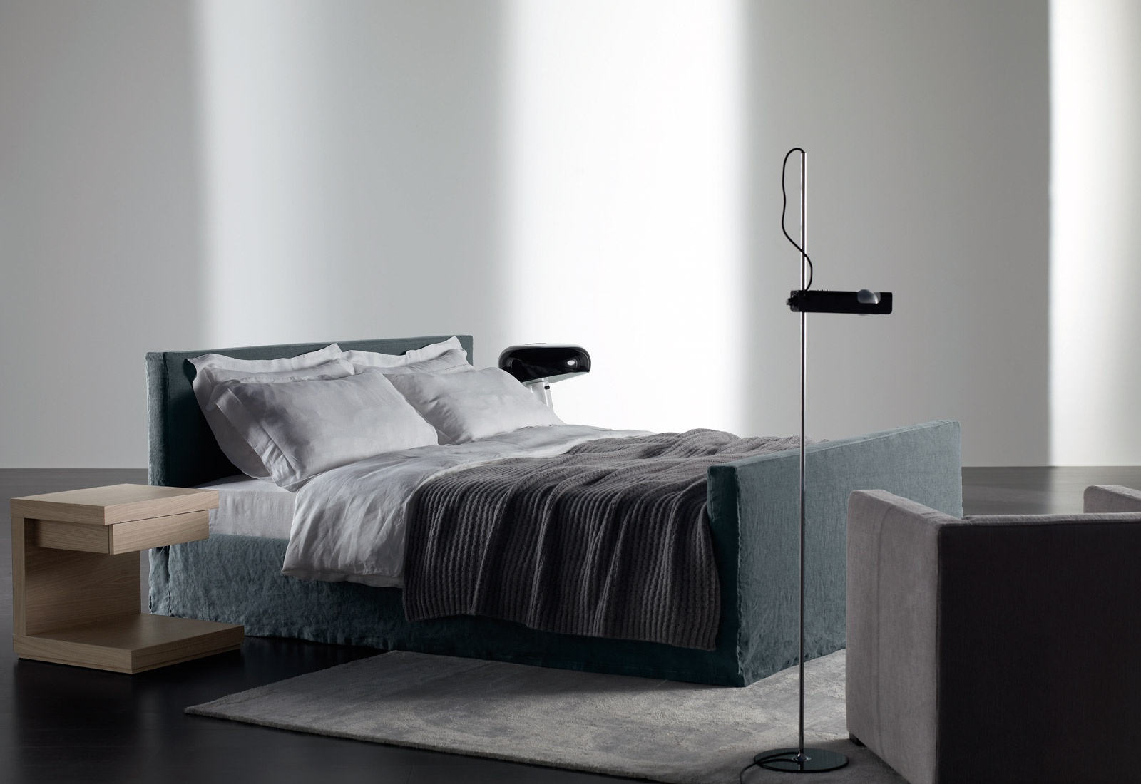 Double bed Bergman from Italian manufacturer Meridiani. The model with headboard and footboard. Material - solid wood. The frame is completely covered with genuine leather. Colors to choose from the collection of the factory. The bed is manufactured in contemporary style.