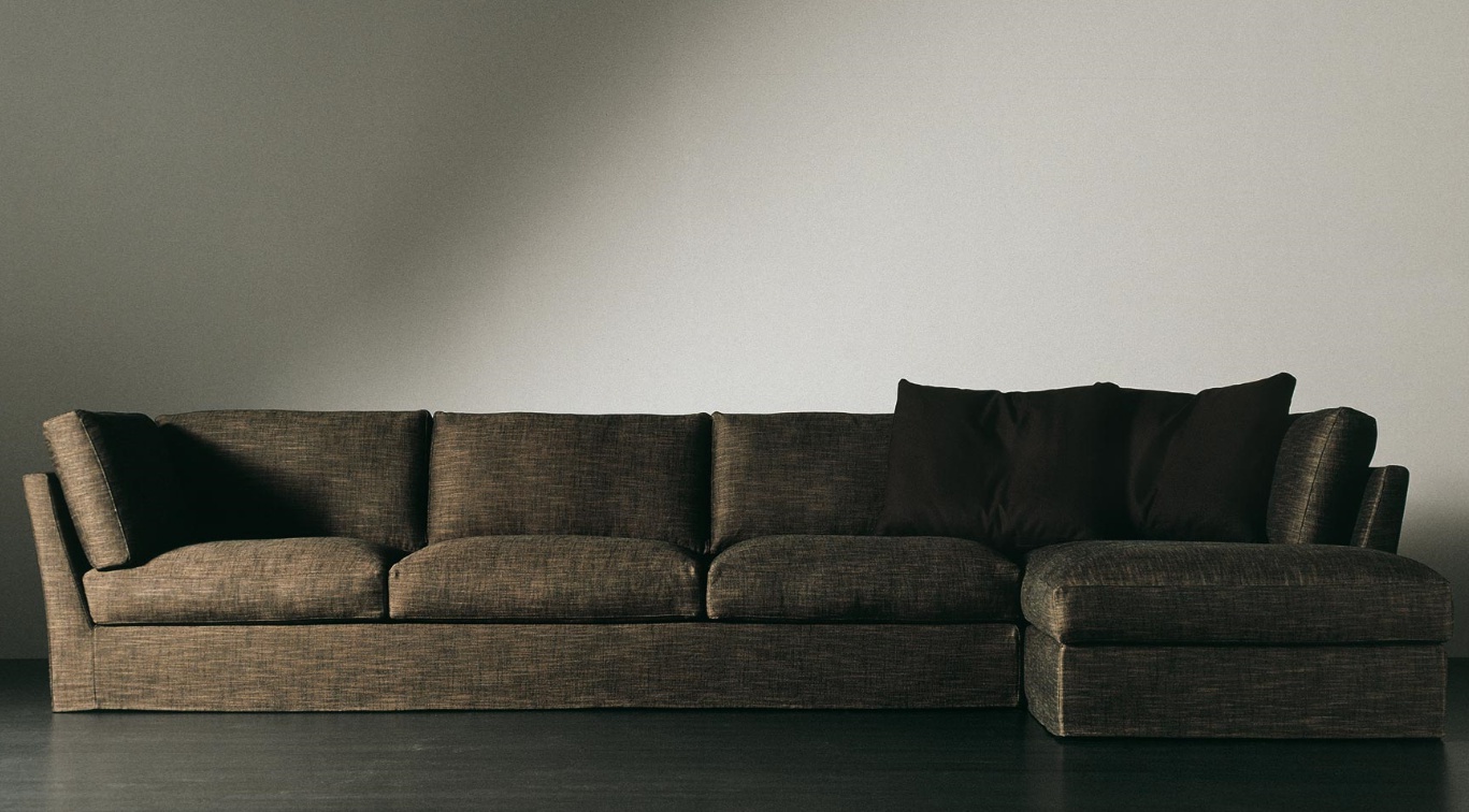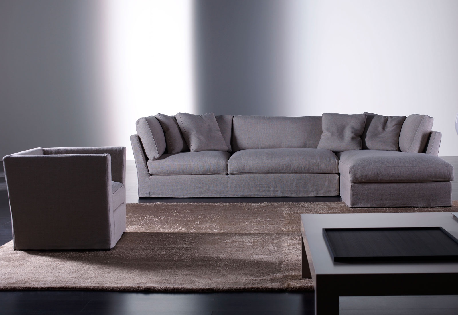 Corner Quinn modular sofa from Italian manufacturer Meridiani. The frame is made from wood. Upholstery textile. The seat cushion and backrest removable. The filler is made of non-deformable polyurethane foam and goose down. The design of complementary decorative pillows. The model is made in modern style.