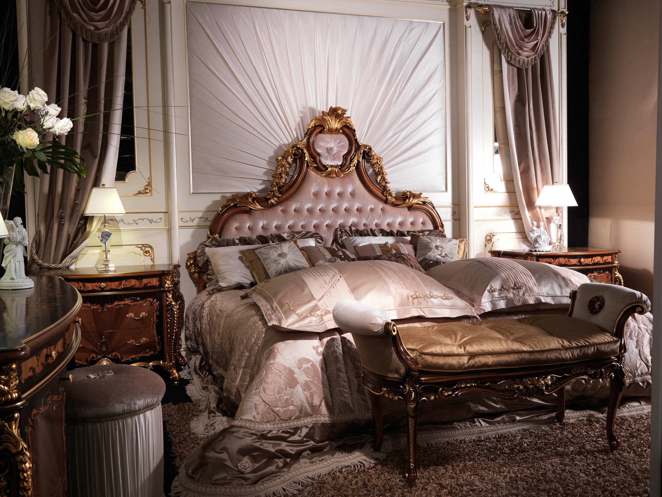 Double bed with high headboard from the Italian manufacturer Cantaluppi. The frame is made from solid wood. Upholstery headboard textile from the company portfolio. The model is decorated with hand carved sculptures. The bed is made in classic style.