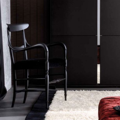Chair with arms CHIAVARI Italian manufacturer MOBILIDEA. The chair is made in the style of 30-ies, with a low backrest and wooden armrests. The company offers two types of upholstery and fine fabrics or leather. The frame of this chair is made of solid wood of dark color. This model has a concise form of arms inherent in that time.