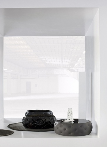 Glam Glass coffee table from Italian manufacturer Bonaldo. Filler - foam, top - glass, upholstery - leather or textiles from a range of campaigns. Model round shape. Great selection for modern interiors. Colors: gray, black.