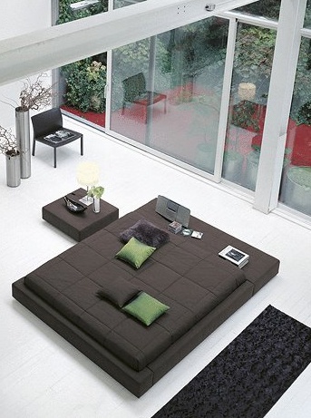 Double bed on a frame of wood covered with leather or fabric squaring trait isola, Bonaldo