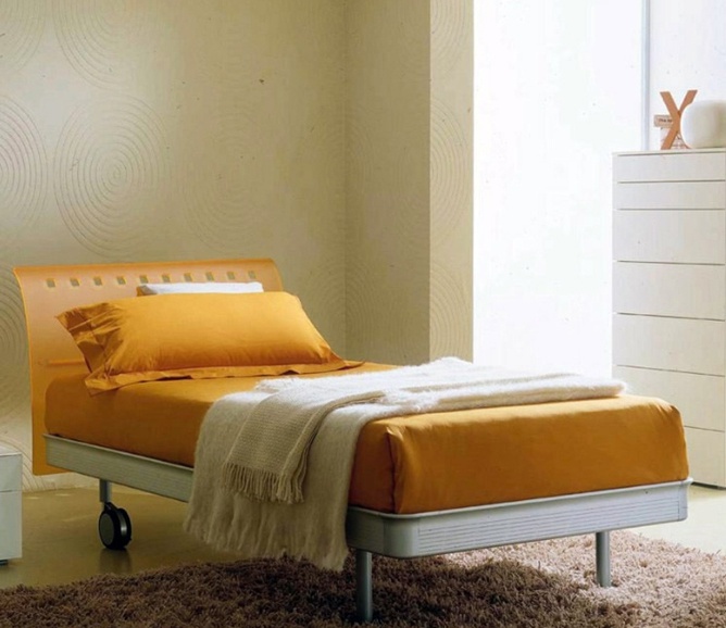 Horo single bed from Italian manufacturer Bontempi Casa. The frame is made of aluminum, the head is plastic. The model is intended for bedrooms in modern style. Colors: beige, yellow, blue.