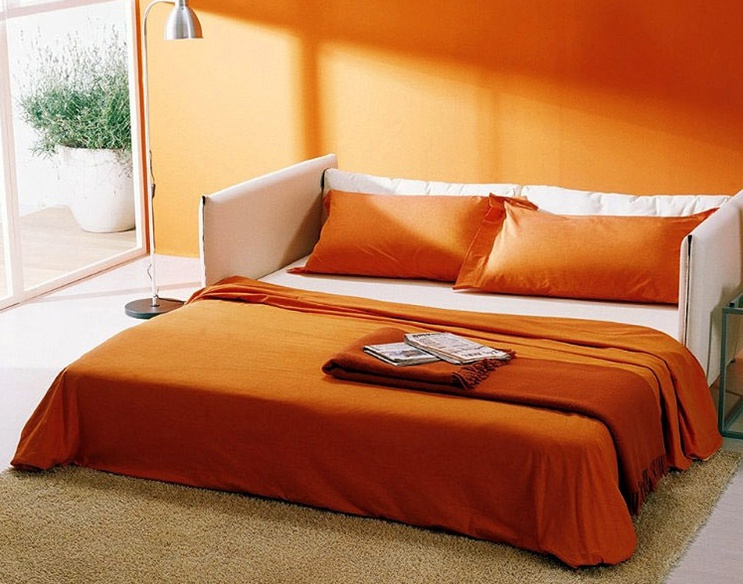 Sofa bed Kiri from Italian manufacturer Bontempi Casa. The frame is made of metal, upholstery - textiles from a range of campaigns. The model is designed for living room in modern style. The design of complementary decorative pillows. Colors: white, beige, orange.