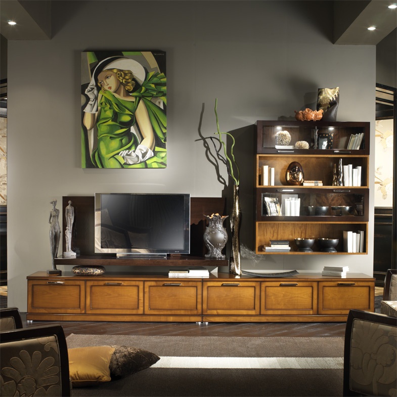 Modular system Fly from the Italian manufacturer Arte Brotto. The body is made from solid cherry. Furniture gives a great relief to the interior thanks to a special distribution of shelves and cupboard base. A lovely choice for the living room in a classic style. Colors: natural wood color, brown.
