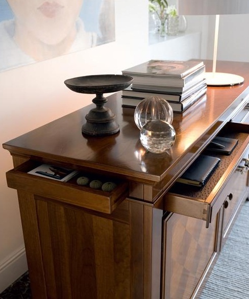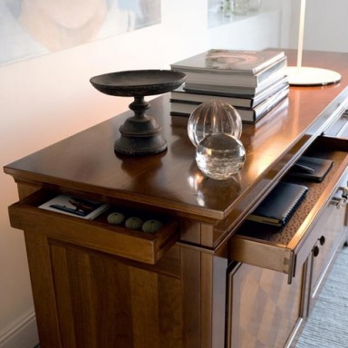 The buffet from the Italian manufacturer Bruno Piombini. The frame is made from solid poplar. Model with drawers and hinged doors. The model is decorated with inlaid-marquetry. Perfect choice for modern interiors. Colors: natural wood color, brown.