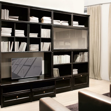 Model storage system Comp 18 from the Italian manufacturer Bruno Piombini. The frame is made from solid wood, veneer finish. The surface is treated with varnish from the range of the campaign. Fold - deaf/mirrored or frosted glass. Module for books and TV. The wall is designed for the living room in a modern style. Colors: white, black.