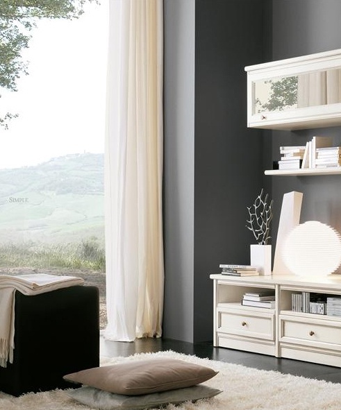 Modular storage system 60 Comp from the Italian manufacturer Bruno Piombini. The frame is made from solid wood, finish - veneer wood. The surface is treated with a varnish of white color. Facade - aged. Sash - blind/glass. Module for books and TV. Wall decorate living room in modern style.
