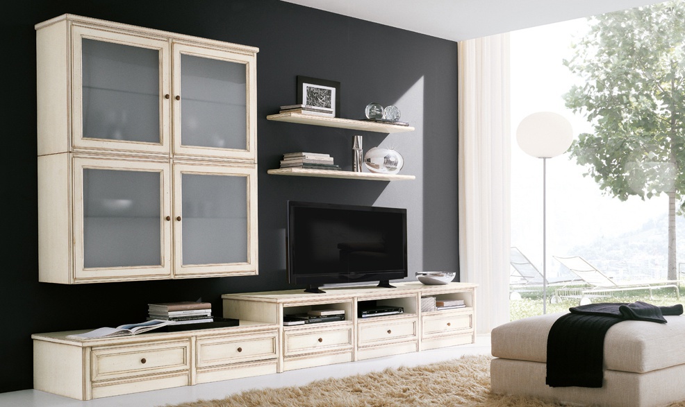 Modular storage system Comp 77 from the Italian manufacturer Bruno Piombini. The frame is made from solid wood, finish - veneer wood. Sash - blind/glass. Facade - aged. Module for books and TV. The model is designed for living room in modern style. Product color white.