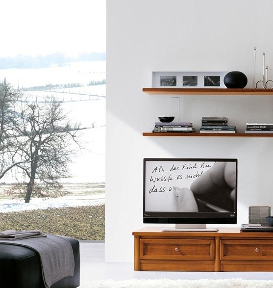 Modular storage system Comp 78 from the Italian manufacturer Bruno Piombini. The frame is made from solid wood, finish - veneer wood. Facade - aged. Module for books and TV. Wall decorate living room in modern style. Colors: natural wood color, brown.