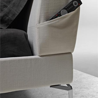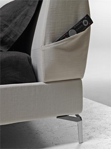 Double bed Tea Time Bed from Italian manufacturer Molteni. The model is made in modern style. Legs are made from metal. Wooden frame covered with textile. A feature of the design gives a low upholstered headboard and roomy pockets located on the sides.