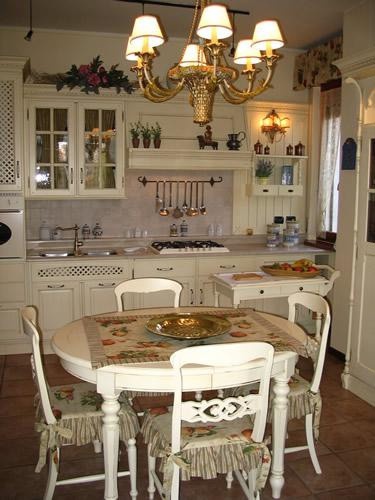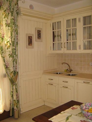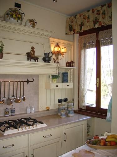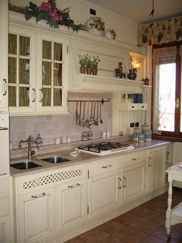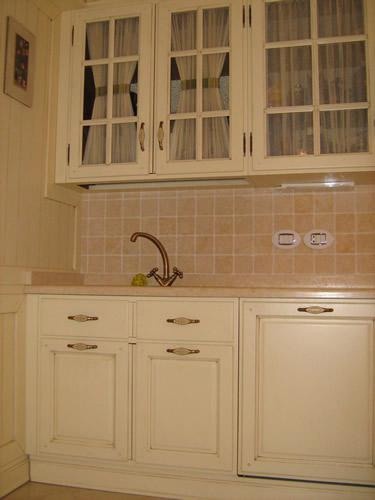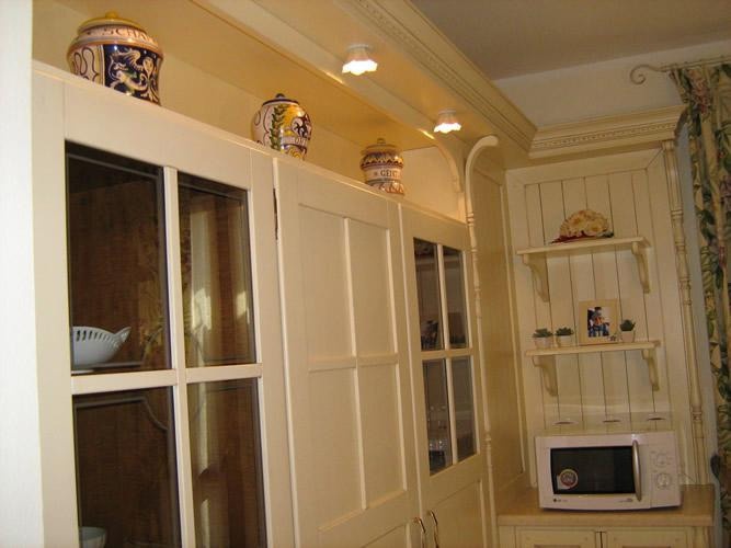 Set for the kitchen Cottage 2 from the Italian manufacturer Arcari. The frame is made from solid wood, countertop - marble, upholstery - textiles from a range of campaigns. The facade is glass. The handmade decor. Set in the style of Provence. Color range: light, white.