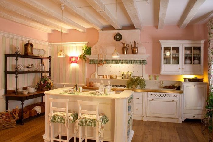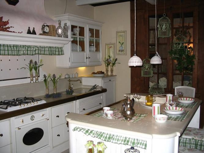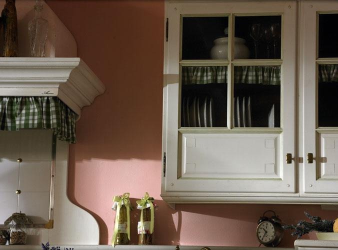 Set for kitchen 1 Florence from the Italian manufacturer Arcari. The frame is made from solid wood, countertop - marble, upholstery - textiles from a range of campaigns. The facade is glass. Fittings - metal. Set in the style of Provence. Color range: light, white.