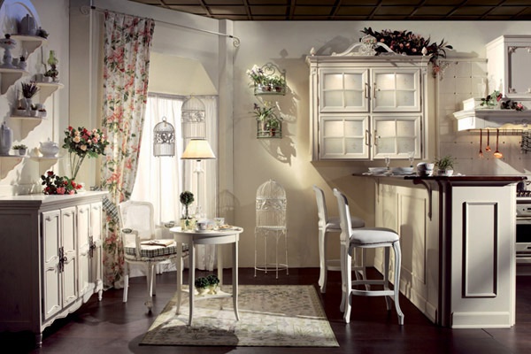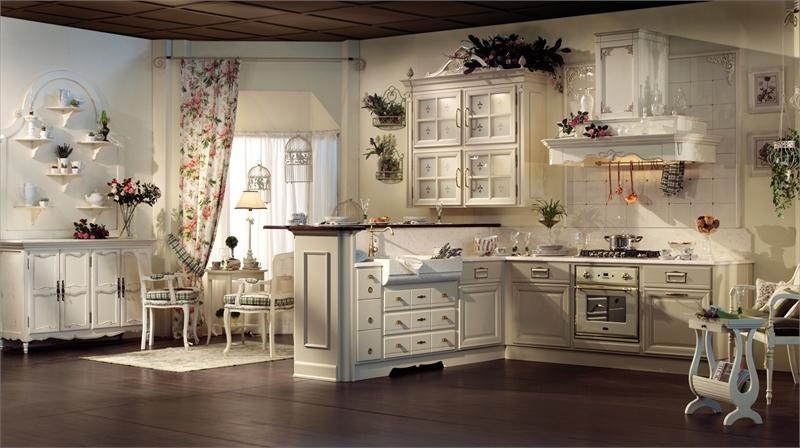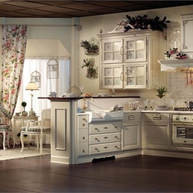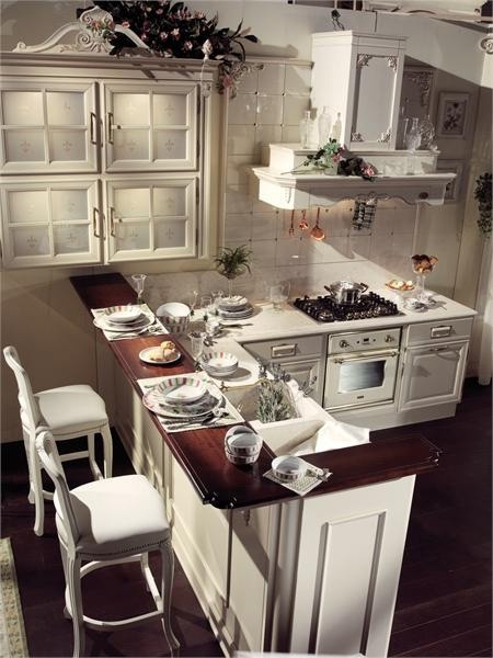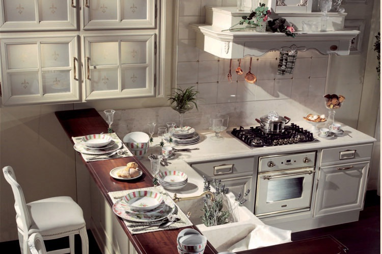 Set for the kitchen 4 Florence from the Italian manufacturer Arcari. The frame is made from solid wood, countertop - marble. The facade is glass. Kitchen with built-in illumination. Set in the style of Provence. Color range: light, white.