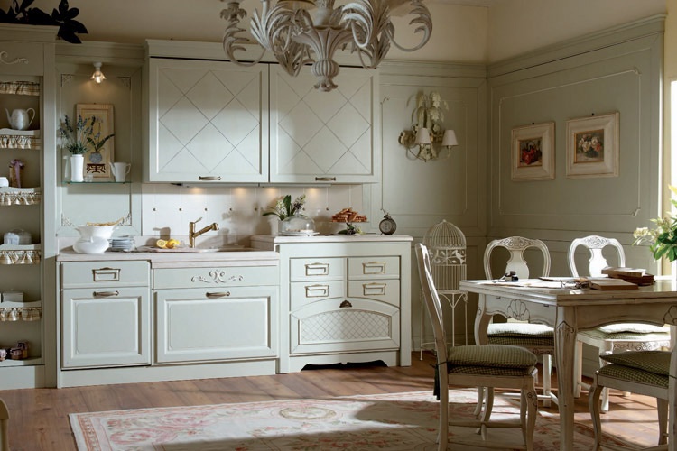 Set for the kitchen Melograno 8 from the Italian manufacturer Arcari. The frame is made from solid wood, countertop - marble. Front - glass/solid wood. Set in the style of Provence. Colours in stock.