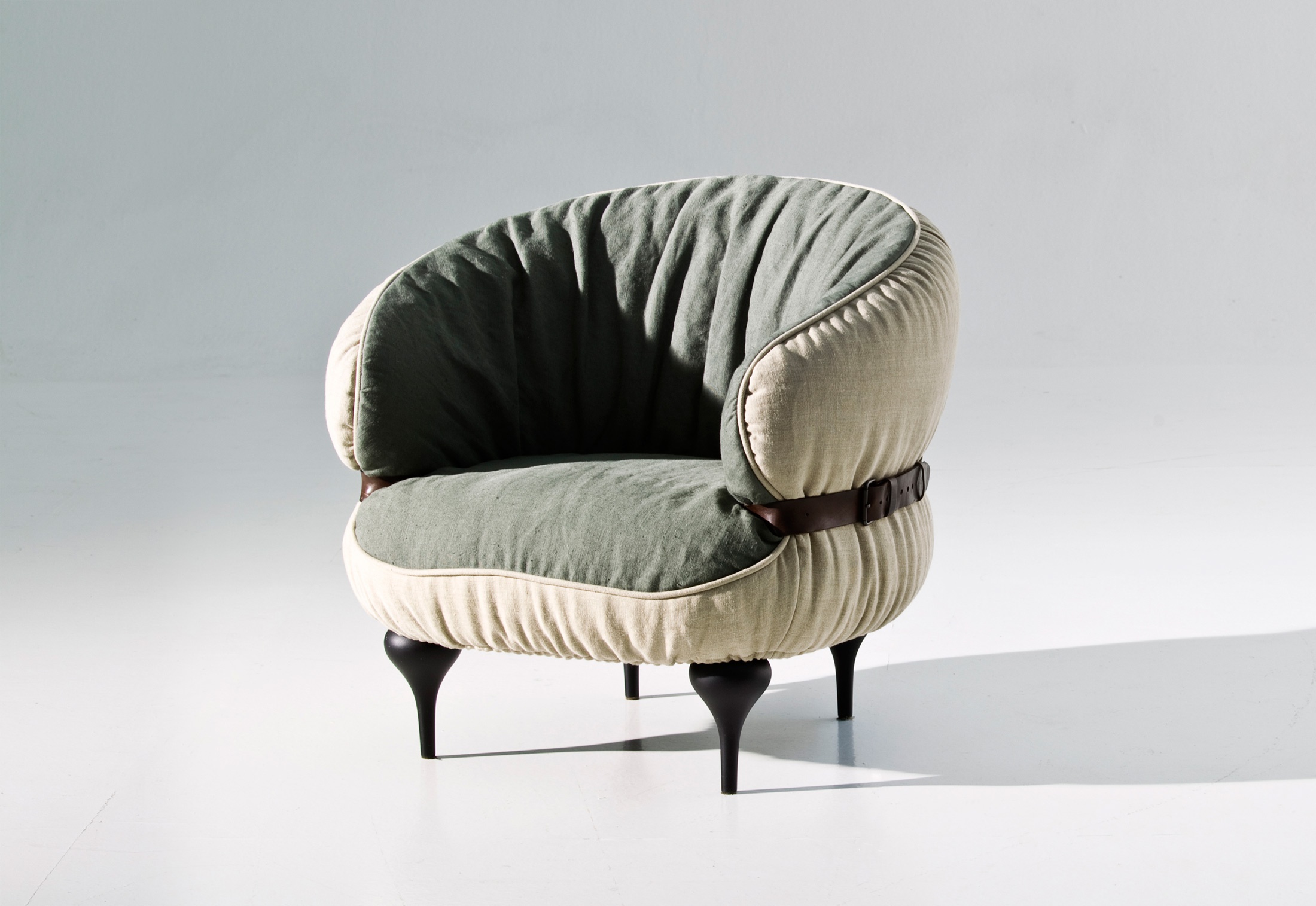 The armchair Chubby Chic armchair from the Italian manufacturer Moroso. The back is rounded smoothly into the armrests. The frame is hidden. The legs are made of solid wood. Upholstery textile from the company directory. Filler - polyurethane foam. The originality of the design adds a brown belt. The model is made in a modern style.